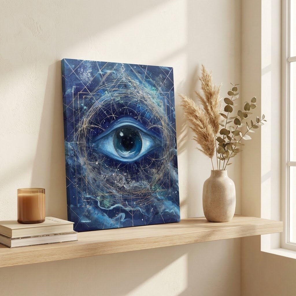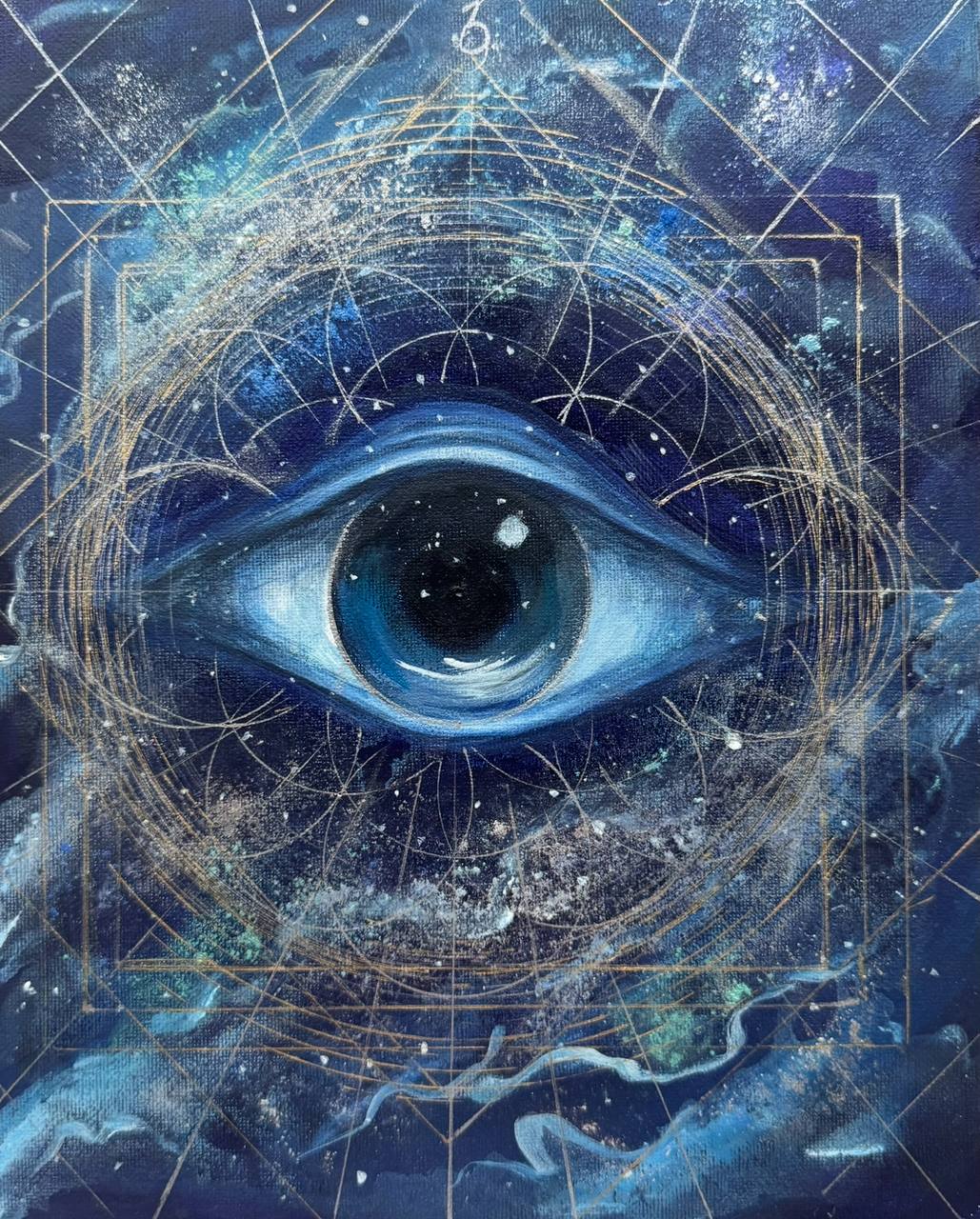 Сакральные символы картины — цветок жизни, круг, квадрат, ромб, лучи, а также числовые коды 3–6–9 и синий спектр цвета — активируют быструю сборку материи, ускоряют проявление результатов и помогают сознанию работать в новом формате.