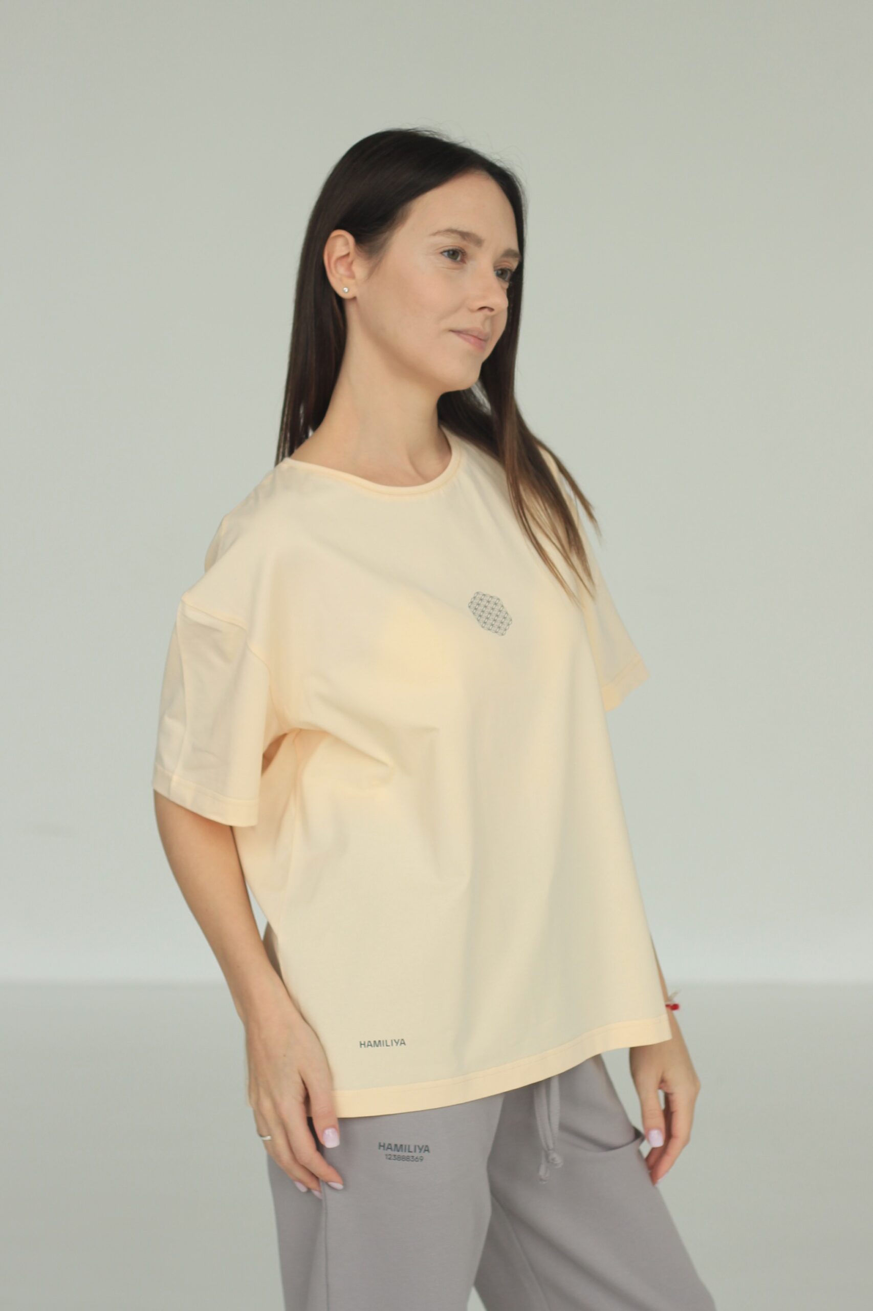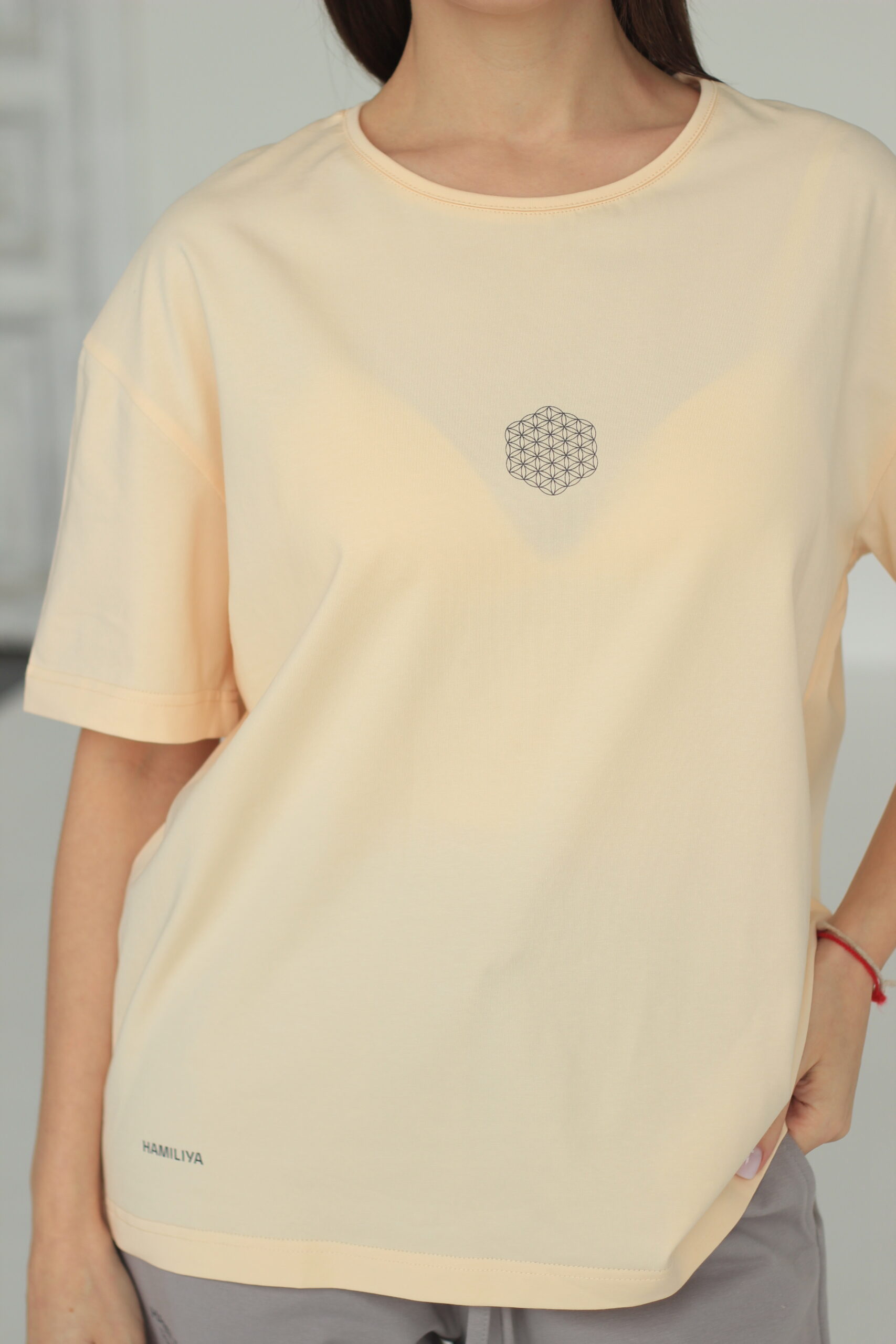 Базовая oversize модель с округлой горловиной поможет вам в создании множества образов на каждый день. На футболке нанесен символ сакральной геометрии "Цветок жизни" и логотип HAMILIYA. Изготовлена из особо дышащей ткани, не сковывает движения при ходьбе, в ней вы будете чувствовать себя уютно и комфортно. Футболка идеально сочетается с различными изделиями и цветами из нашей коллекции, предоставляя вам бесконечные возможности для творчества и модных экспериментов. Параметры модели: 164 см, грудь 87 см, талия 63 см, бедра 90 см. На модели размер XS. Изготовлена на производстве HAMILIYA в России г. Новосибирск.
